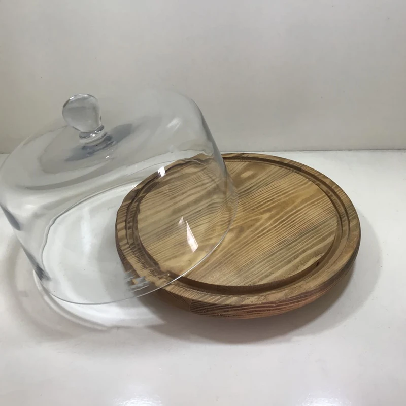 Wholesale Handmade 8 inch 10 inch Rubber Wood Cake Stand with Glass Dome