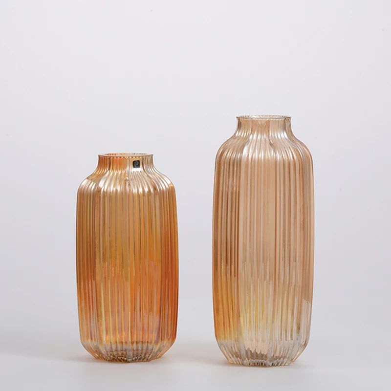 Customized electro-water amber vertical strip tall glass vase design decorative glass flower vase on sale