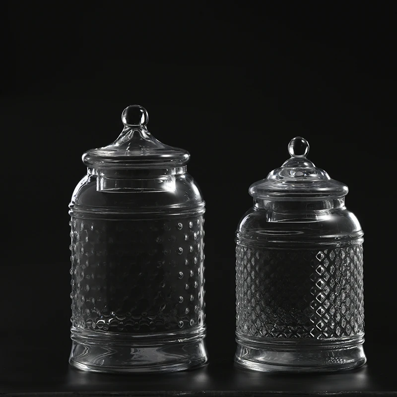 Factory for wholesaler transparent glassware with floral glass candy jar or marshmallow jar with glass lid for food storage