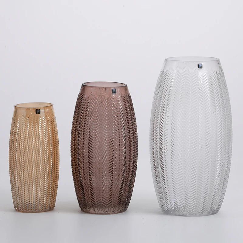Hand-Blown colored glassware with hot sale floral and vertical strip design glass flower vase Chinese manufacture