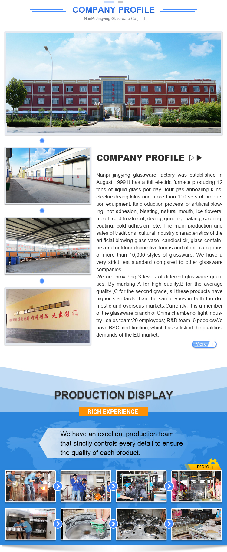 Q: Are you factory or trading company? A: We are a factory(manufacturer) in Hebei Province; we have trading office in Cangzhou, Hebei.       Q: Where is your factory and trading office located? How can I visit there? A: Our factory is located in CANGZOU CITY, Hebei Province, China, about 1 hours from Beijing south station to CANGZHOU WEST station by high-speed train.       Q: What is the main product of your company? A: We mainly produce: artificial blowing glass vase, candlestick, glass containers and outdoor decorative lamps etc.       Q: How can I get some samples, what is the leading time? A: We are honored to offer you samples to test and check quality. Customers should pay for the shipping freight. The samples’ leading time will be 7-10 days.       Q:What is your payment term? A: 30% TT deposit (better within 7 days) ,70% against copy of B/L or L/C at sight.       Q: What’s the customized MOQ? A: According to the customers’ demand, usually our normal MOQ is 300-500pcs. But for the trial cooperation between us, low quantity could be accepted. Everything is negotiable.       Q: How long is the mass production lead time? A: Normally, the delivery time is about 30-40days after receiving deposit of T/T at sight.