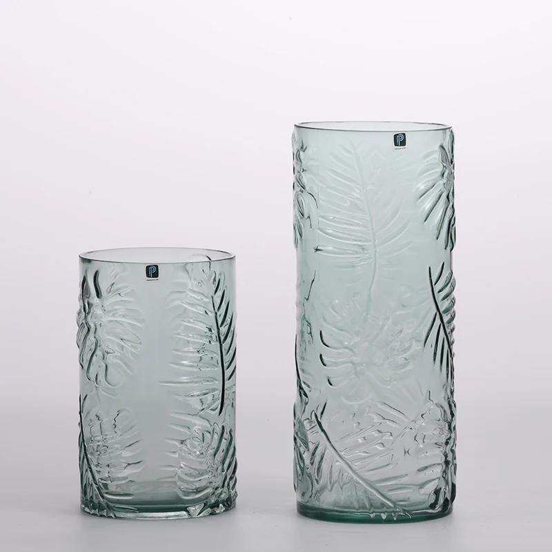 Hand-blown green color transparent hot sale floral design glassware for home decors glass flower vase Chinese manufacture