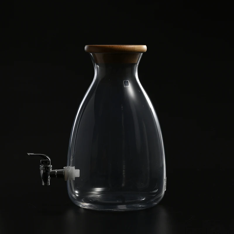 High quality kitchen heavy-duty glassware with wooden top hand-blown transparent glass juice jar with tap on sale