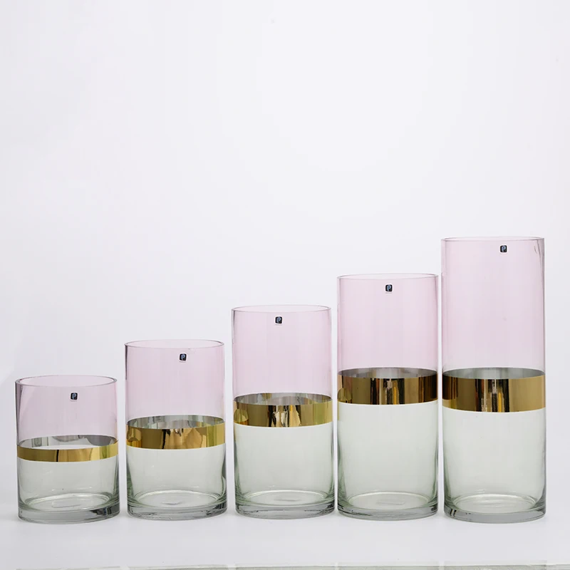 Heavy duty high quality cylinder glass vase with golden circle glass flower vase Chinese manufacture