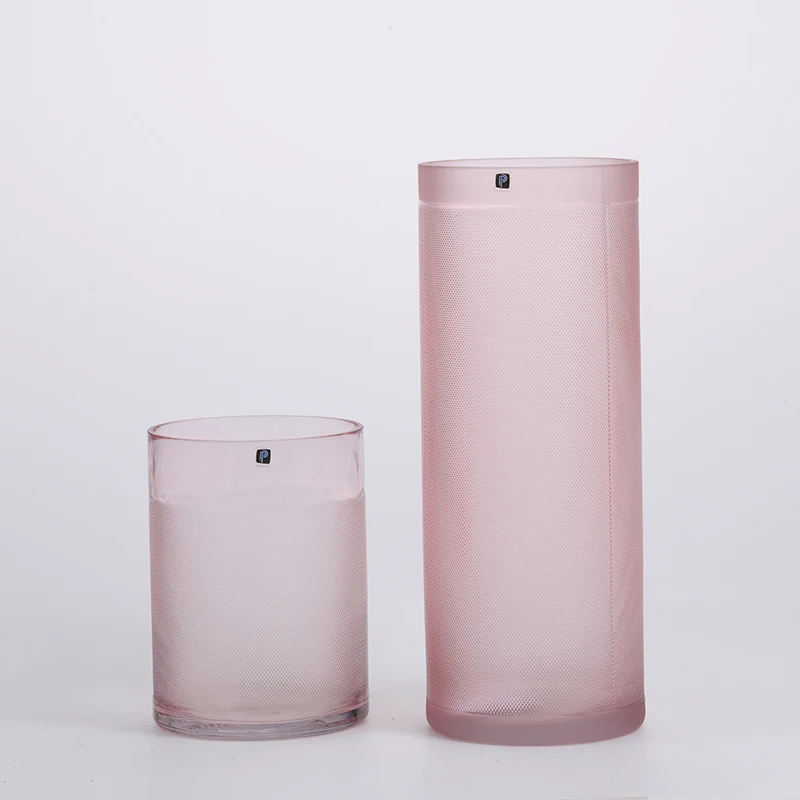 Pink floral vertical strip cylinder design nature mouth heavy duty glass flower vase for home decoration