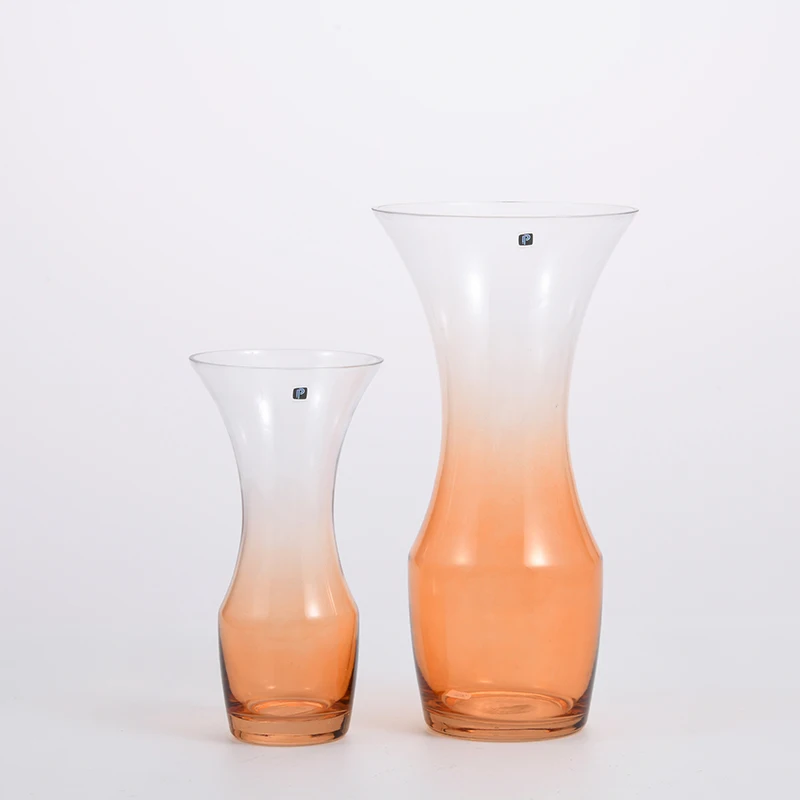 Transparent gradient colored with orange bottom and open mouth glass flower vase for home or office decoration